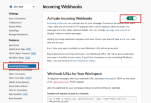 アプリの管理画面(Basic Information)に入れたら、左メニューの[Incoming Webhooks]をクリック。 そして、[Activate Incoming Webhooks]のスイッチをパチっとOnにします。
